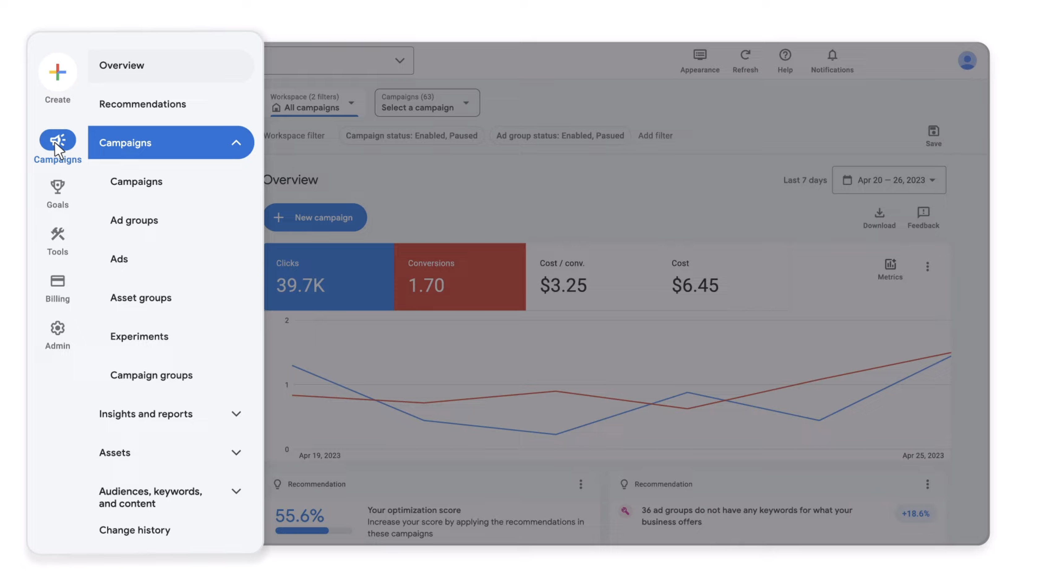 Take a look inside the redesigned Google Ads platform with streamlined navigation, comprehensive campaign tools, enhanced insights, and additional tools for optimized ad management.